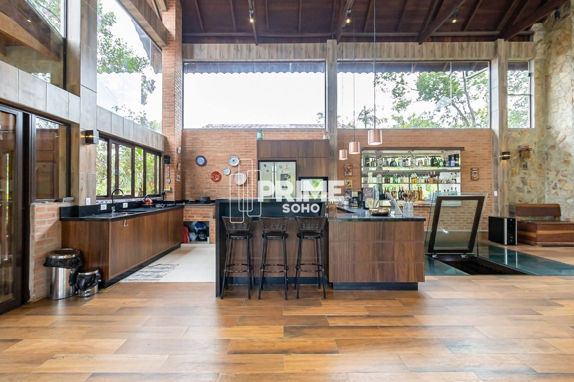 Cozinha gourmet com fogão a lenha, forno a lenha e churrasqueira